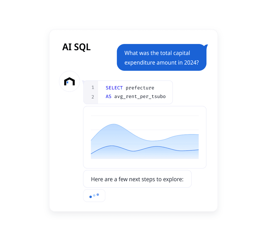 Query your data in natural language. No engineer, no data analyst required. Just ask our AI to dive into the database and surface the insights you need. Gather tailored insights, uncover hidden patterns, and identify risks and opportunities that might otherwise go unnoticed. With AI as a partner, investors gain deeper understanding and greater confidence to make informed, strategic decisions.